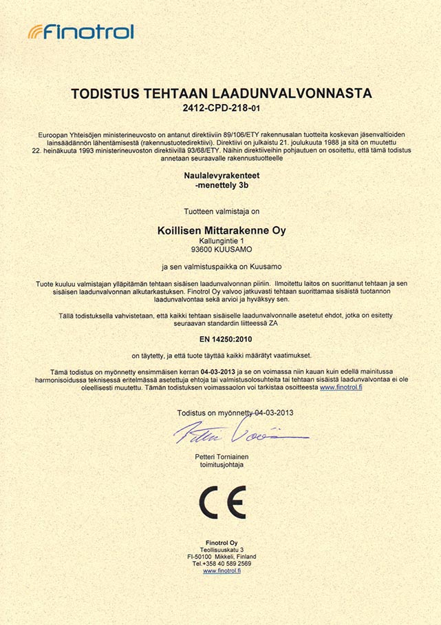 Finotrol Oy:n myöntämä varmennustodistus kattoristikoidemme laadunvalvonnasta ja CE-merkinnästä.